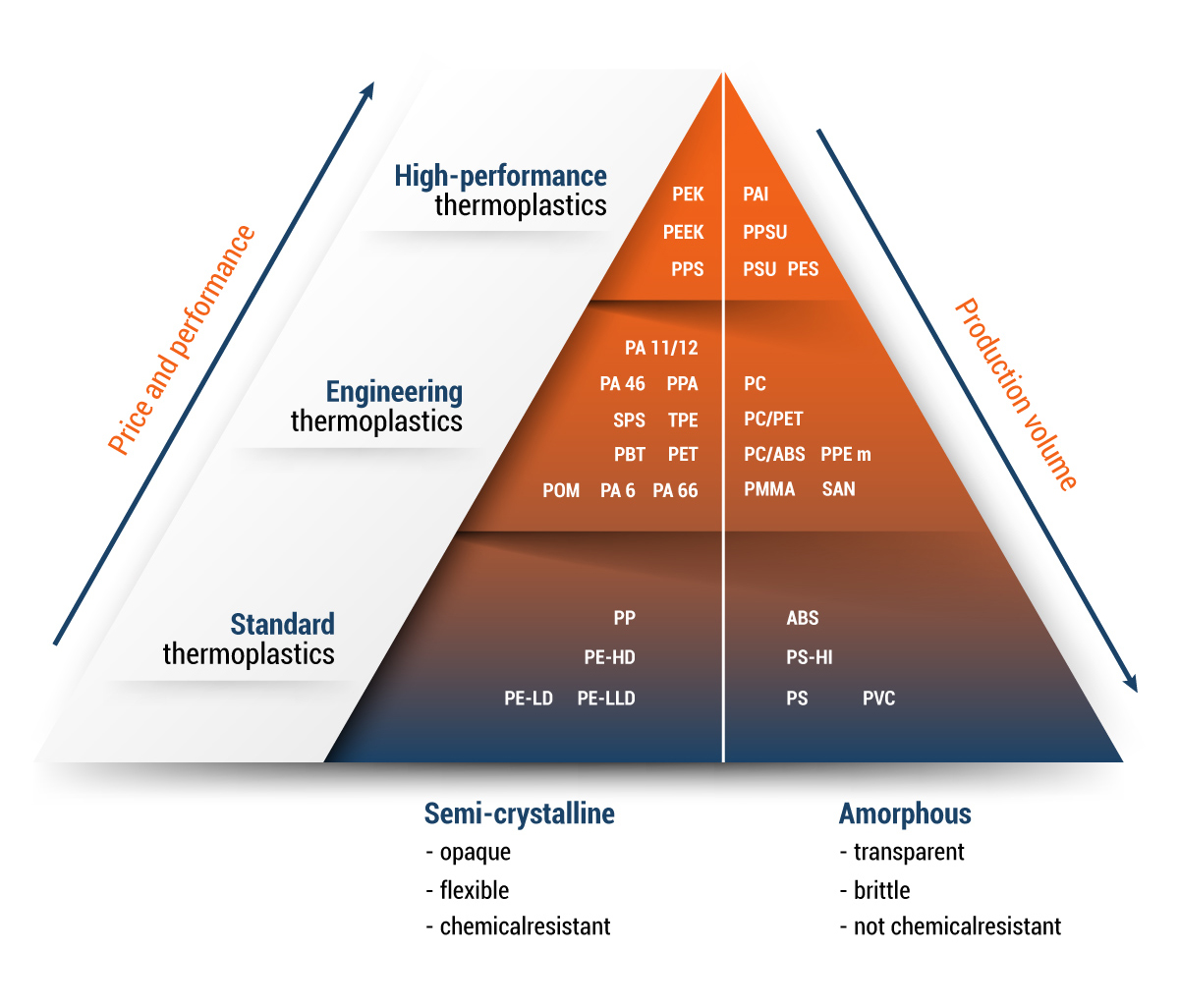 Ogni materiale ha le sue caratteristiche specifiche e di applicazione: trasparenza, resistenza chimica, rigidità, proprietà ottiche, resistenza agli UV e condizioni ambientali diversi e molto altro. Condividi con noi le tue esigenze e sapremo guidarti nella scelta migliore, i materiali riportati di seguito sono parte della nostra disponibilità di plastiche e gomme per la produzione di prodotti.